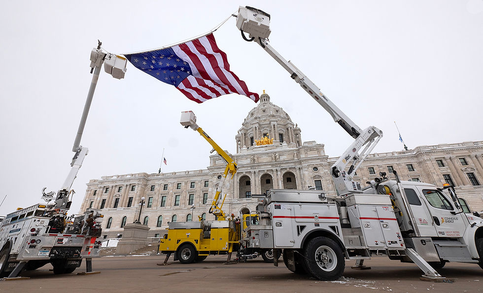 The Minnesota Rural Electric Association sponsored a group of electric linetrucks flying an American flag in front of the Capitol for the association’s “Day on the Hill”.